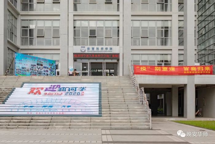 体育科学学院的楼梯上附有“欢迎新同学”的地贴,门口的展板呈现体育教学教育成果,不少新生兴奋地在展板前合影留念。院楼内分为报到区与等候区两个区域,有效分散人流,方便新生办理相关手续。