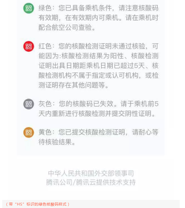 (二)在已实施凭新冠病毒核酸检测阴性证明登机的国家(相关国家列表请点击链接查看:https://hr.cs.mfa.gov.cn/help_two/help-two/gj.html,请留意国家名单数量变化)中转赴华,搭乘航班的中、外籍乘客,在中转时亦会被查验带“HS”标识的绿色核酸码或健康状况声明书。带绿色核酸码和健康状况声明书的有效期起始点是核酸检测证明的出具日期,请在绿色核酸码或健康状况声明书有效期内中转,否则将在中转地登机受阻。