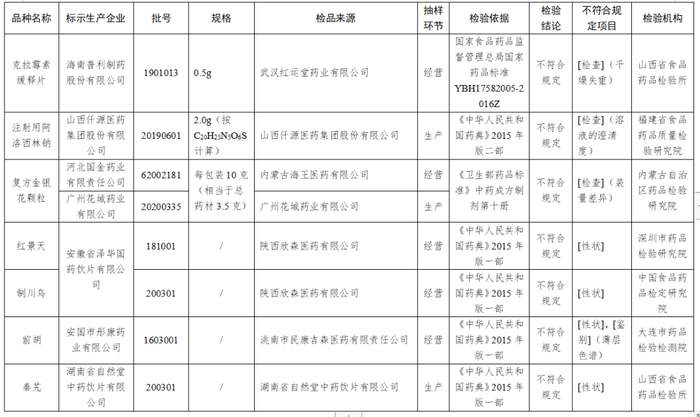 经深圳市药品检验研究院和中国食品药品检定研究院分别检验,标示为安徽省泽华国药饮片有限公司生产的1批次红景天和1批次制川乌不符合规定,不符合规定项目均为性状。