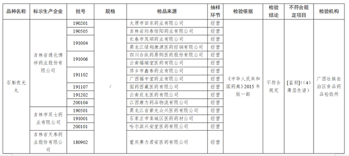 经广西壮族自治区食品药品检验所检验,标示为吉林省通化博祥药业股份有限公司、吉林市双士药业有限公司、吉林省天泰药业股份有限公生产的12批次石斛夜光丸不符合规定,不符合规定项目为鉴别。