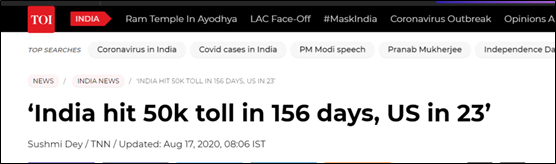 8月17日,《印度时报》曾在报道中称:“印度的死亡病例超5万用了156天,而美国只用了23天”。除了这么个非常“丧事喜办”的措辞外,这篇报道还表示,印度的死亡率远低于包括美国在内的不少国家,并以此标榜印度“防控得力”。