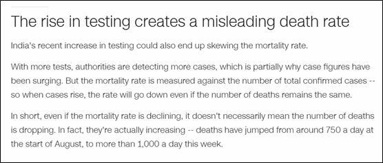 或许是怕读者感受不到印度疫情的严重,没法凸显美国的“稳定”,报道还专门强调:“印度死亡率低,不意味着他们的死亡数在变少”。