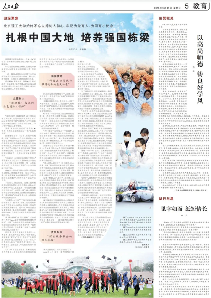 2020年9月19日,北京理工大学即将迎来八十周年校庆。今日,《人民日报》对北京理工大学始终不忘立德树人初心,牢记为党育人、为国育才使命——扎根中国大地 培养强国栋梁进行报道。现登载如下,以飨读者。