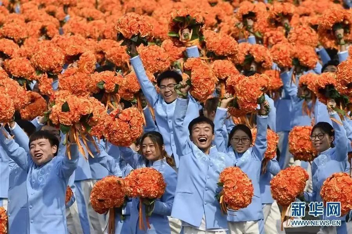 图①:2019年10月1日,新中国成立70周年庆祝活动中,北京理工大学师生组成的“与时俱进”群众游行方阵通过天安门广场。