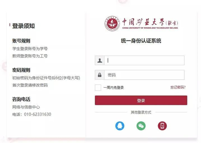 统一身份认证访问地址:http://auth.cumtb.edu.cn/authserver。统一身份认证账户:账号:学号;初始密码:身份证后六位(遇X大写)。