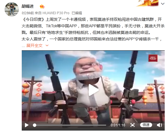 原标题:印度媒体出恶搞视频,渲染“莫迪双枪击毙中国APP”,胡锡进:令人震惊