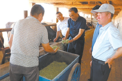 石光银(右三)同十里沙村村干部一起,查看合作社养牛情况。
