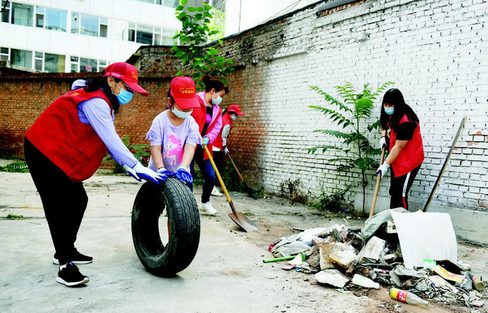 图为桃南一社区居民们一起清扫院落。全媒体记者米国伟摄