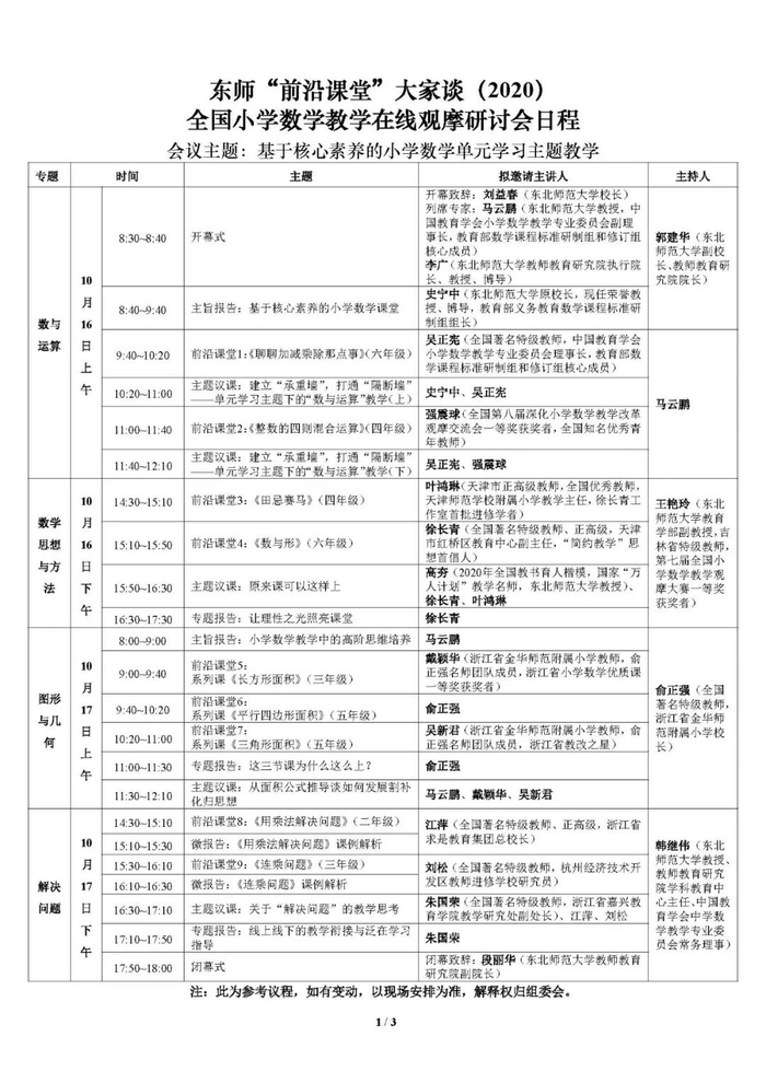 小学 数学 | 10月16日 | 开幕式 | 刘益春 东北师范大学校长 郭建华 东北师范大学副校长 马云鹏 东北师范大学教育学部教授 李 广 东北师范大学教师教育研究院执行院长 |