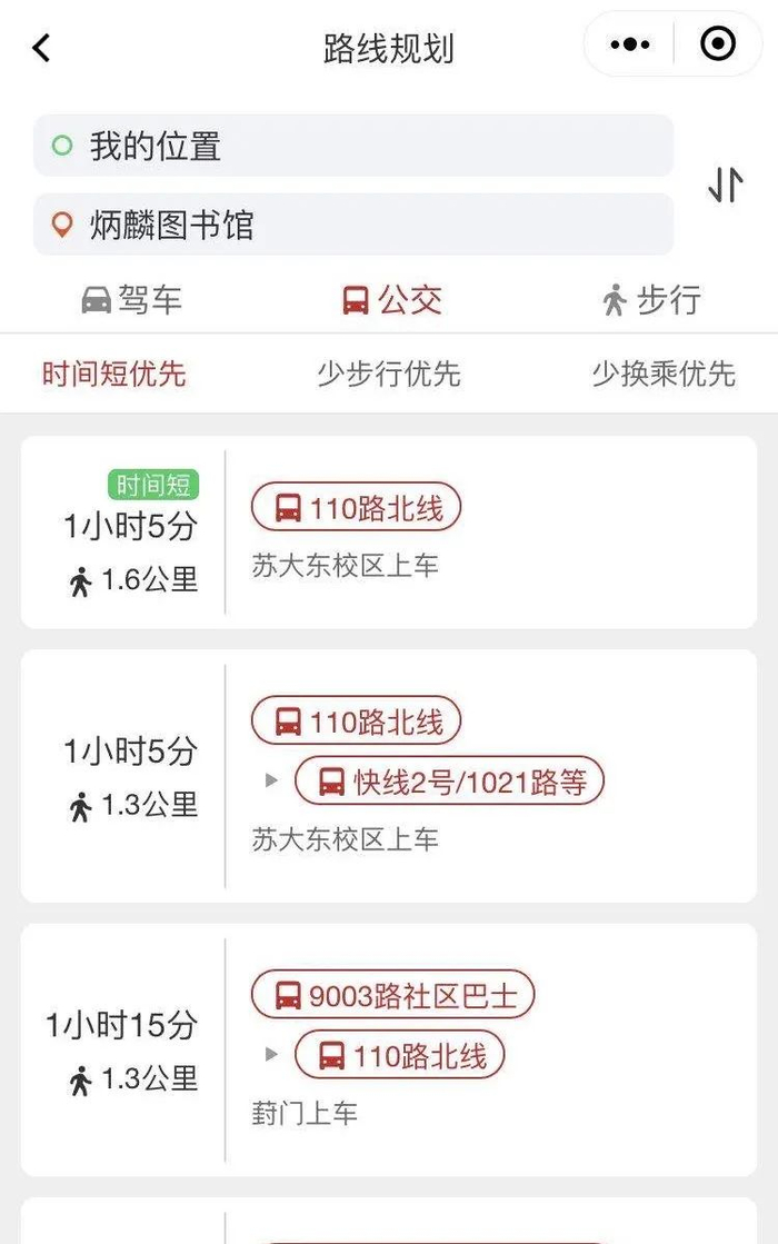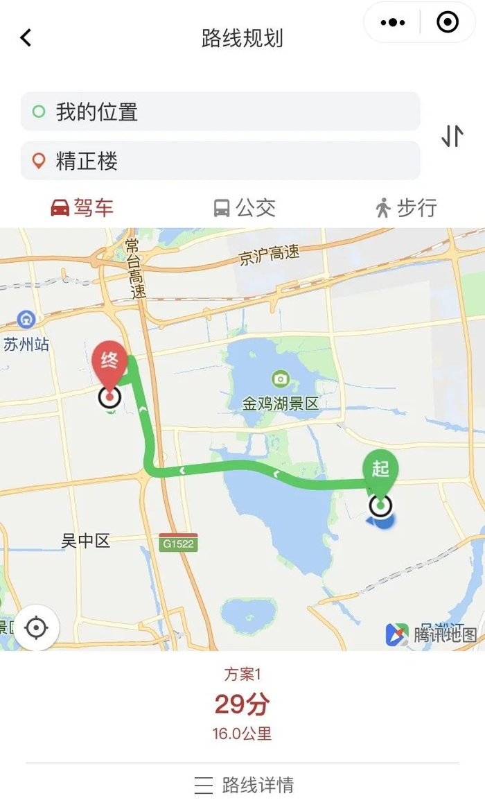 选择你的目的地,点击导航,小程序将为你显示路线图,其中包含驾车、公交、步行三种出行方式,再也不用担心迷失在校园里。