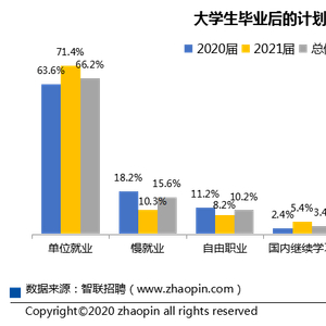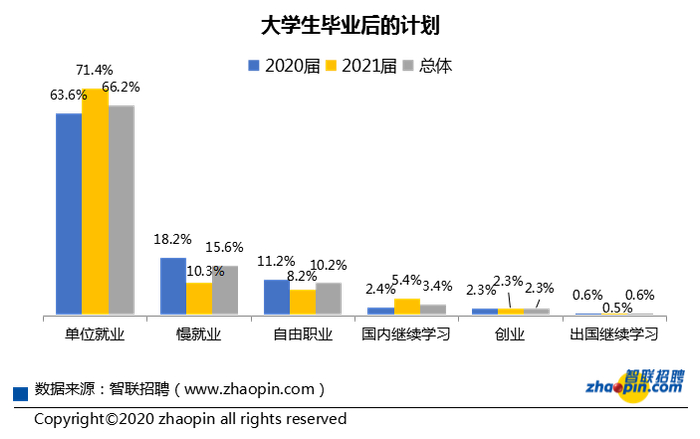 智联招聘今日发布的《2020年秋季大学生就业报告》显示,大学生已成为我国规模最大的首次就业群体,2020年应届生人数为874万,而2021年应届生人数将继续创下新高。疫情阴影下,两届届毕业生求职期相重叠,外加出国留学、创业等发展方向受限,导致整体大学毕业生就业市场供需关系有所失衡。
