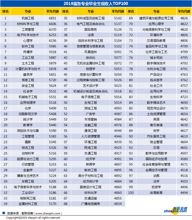 对2019年不同专业毕业生当前的收入水平发现,机械工程以6851元/月成为高薪之首。在互联网迭代与新基建等新兴领域的蓬勃发展下,企业提升核心研发能力的趋势已经形成,因此机械工程专业人才价值居于高位。