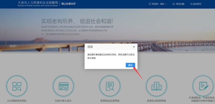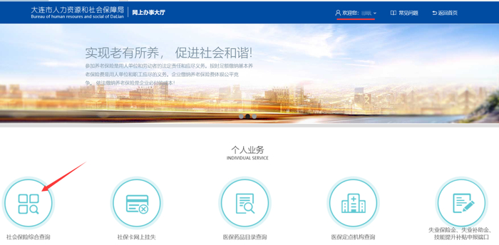 点击“个人业务”→“社会保险综合查询”→ “确定”,进入大连市金保工程信息管理系统。