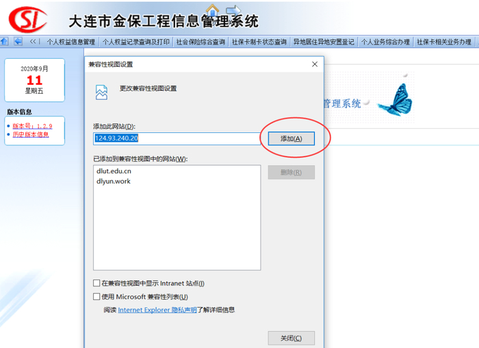屏幕右上角点击浏览器“工具”(Alt+X) →“兼容性视图设置”(Ctrl+B)→点击添加,完成兼容性视图设置。