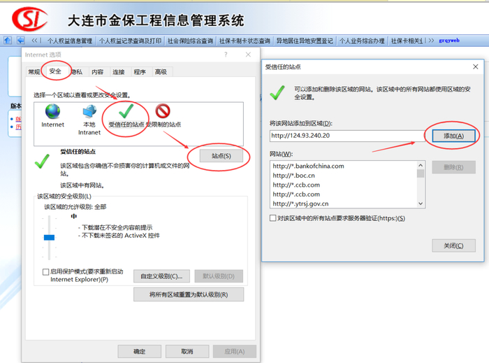屏幕右上角点击浏览器“工具”(Alt+X) →“Internet选项”(Ctrl+O)→“安全”→“受信任的站点” →点击“添加”,完成安全性设置。