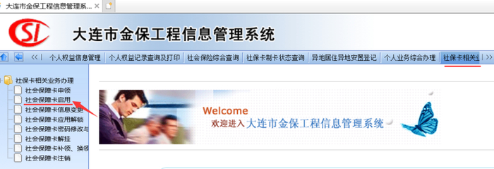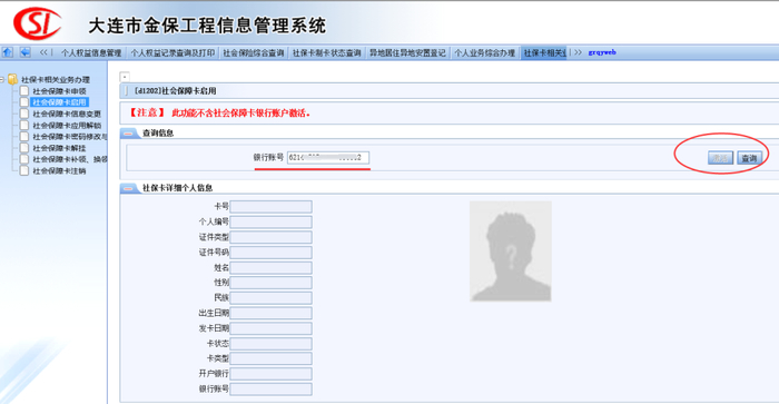 大连市金保工程信息管理系统任务栏选择“社保卡相关业务办理” → “社会保障卡启用”→输入社保卡“银行账号”点击“查询”→“激活”,完成社保卡医保功能激活。