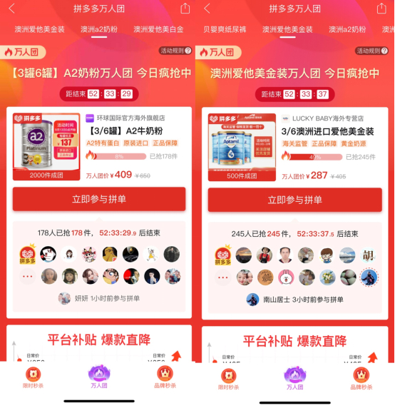 “嗨购母婴日”期间,拼多多上线14个爆款奶粉、纸尿裤“万人团”,A2奶粉降价幅度高达241元。