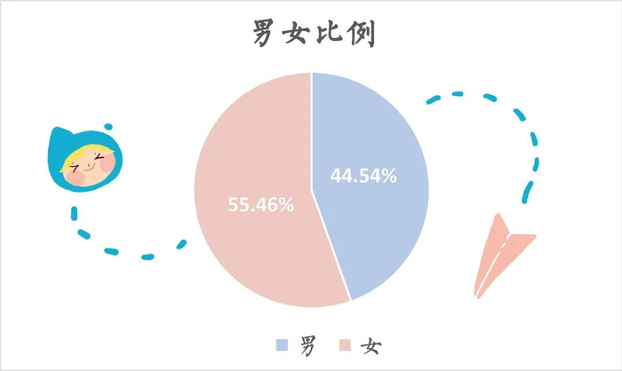 今年华农一共迎来了10027位小萌新(含预科生),其中男生占比44.54%,女生占比55.46%,男女比例相对均衡,太让人实名羡慕啦!