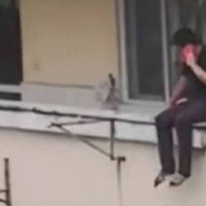 犯罪嫌疑人坐在窗外平台上。网传视频截图