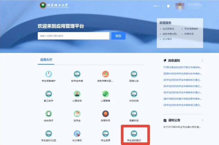 在页面找到【学生返校登记】点击进入。