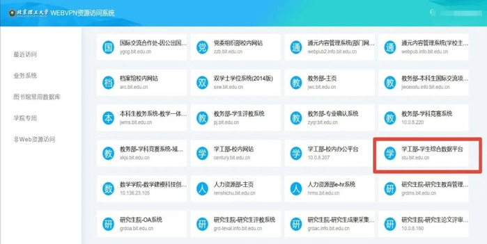在浏览器输入https://webvpn.bit.edu.cn或者点击学校主网站页面下部的【校园网络】使用统一身份认证登录,认证成功就可以进入VPN导航页面。