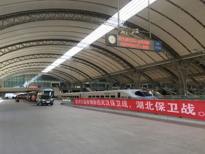 在战“疫”中,汉口车站留守人员勇于担当,主动做好援鄂医护人员的服务和抗疫物资的转运工作,通过主动帮助转运行李、物资,悬挂感恩横幅、广播播放抗疫歌曲等方式,表达湖北人民对于八方支援的感恩之心。