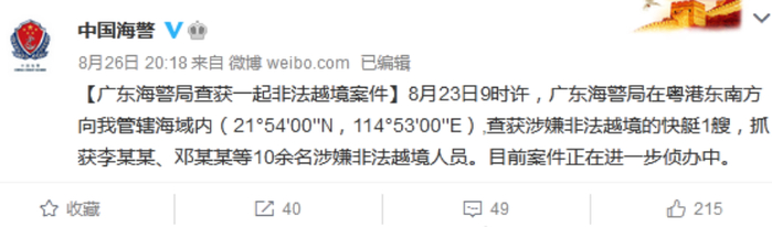 8月26日,中国海警官方微博发文称,8月23日9时许,广东海警局在粤港东南方向我管辖海域内(21°54‘00’‘N,114°53’00‘’E),查获涉嫌非法越境的快艇1艘,抓获李某某、邓某某等10余名涉嫌非法越境人员。目前案件正在进一步侦办中。↓