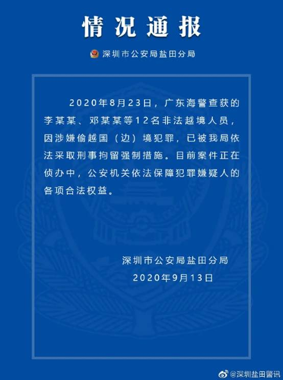 9月13日,据@深圳盐田警训 消息,8月23日广东海警查获的12名非法越境人员,因涉嫌偷越国(边)境犯罪,已被依法采取刑事拘留强制措施。↓