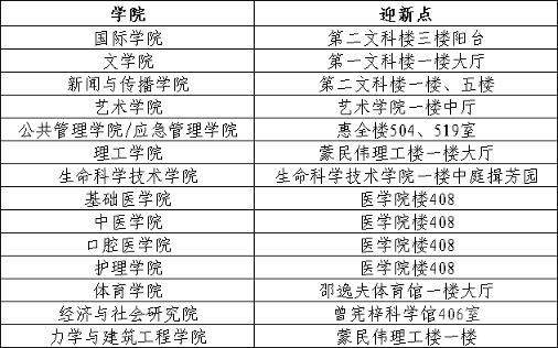 国际学院临床医学、新闻学、食品科学与工程专业;生命科学技术学院、理工学院、力学与建筑工程学院、文学院、新闻与传播学院、公共管理学院/应急管理学院、基础医学院、口腔医学院、护理学院、中医学院、艺术学院、体育学院、经济与社会研究院各专业的本科新生到广州石牌校区南门报到。