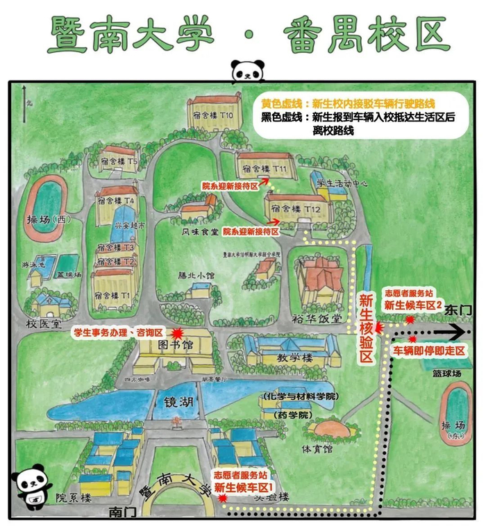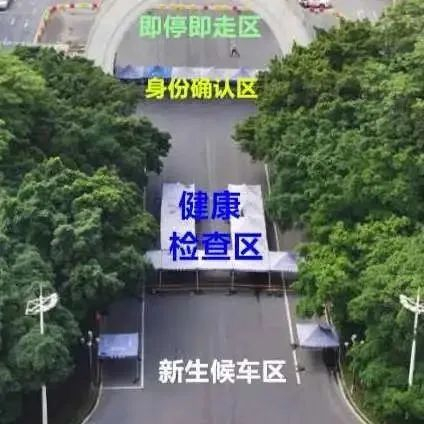 为保障市政交通秩序,新生搭乘的车辆在南门“即停即走区”卸下行李物品后请及时驶离,新生统一从校南门凭粤康码、行程卡及有效证件在“身份确认区”入校。新生经“健康检查区”测温合格后可前往“新生候车点”候车,乘坐校内接驳车前往学生宿舍办理入住,入住完成后前往院系办理其他手续。
