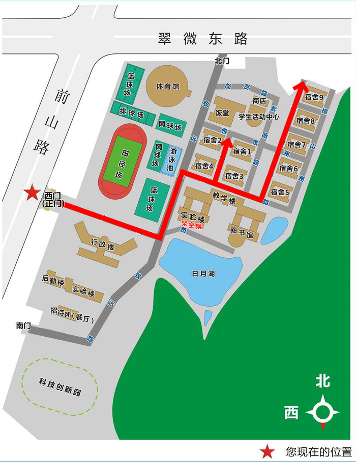 新生从校区西门进校,为保障市政交通秩序,家长送学车辆卸下行李物品后请及时驶离。校区在西门设立迎新总接待站及6个学院学长接待点(此处不办理入学报到手续),各学院迎新学长将会引领新生进入校园和指引新生前往院系接待组(架空层)完成报到手续。