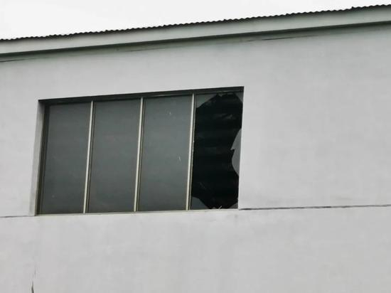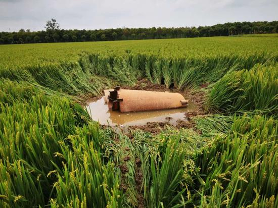 记者在工厂围墙西侧一块农田里看到了飞出的罐体。罐体离围墙有大约有50米左右,罐体在水稻田里砸了一个很深的坑,工厂的部分窗户玻璃发生破裂。