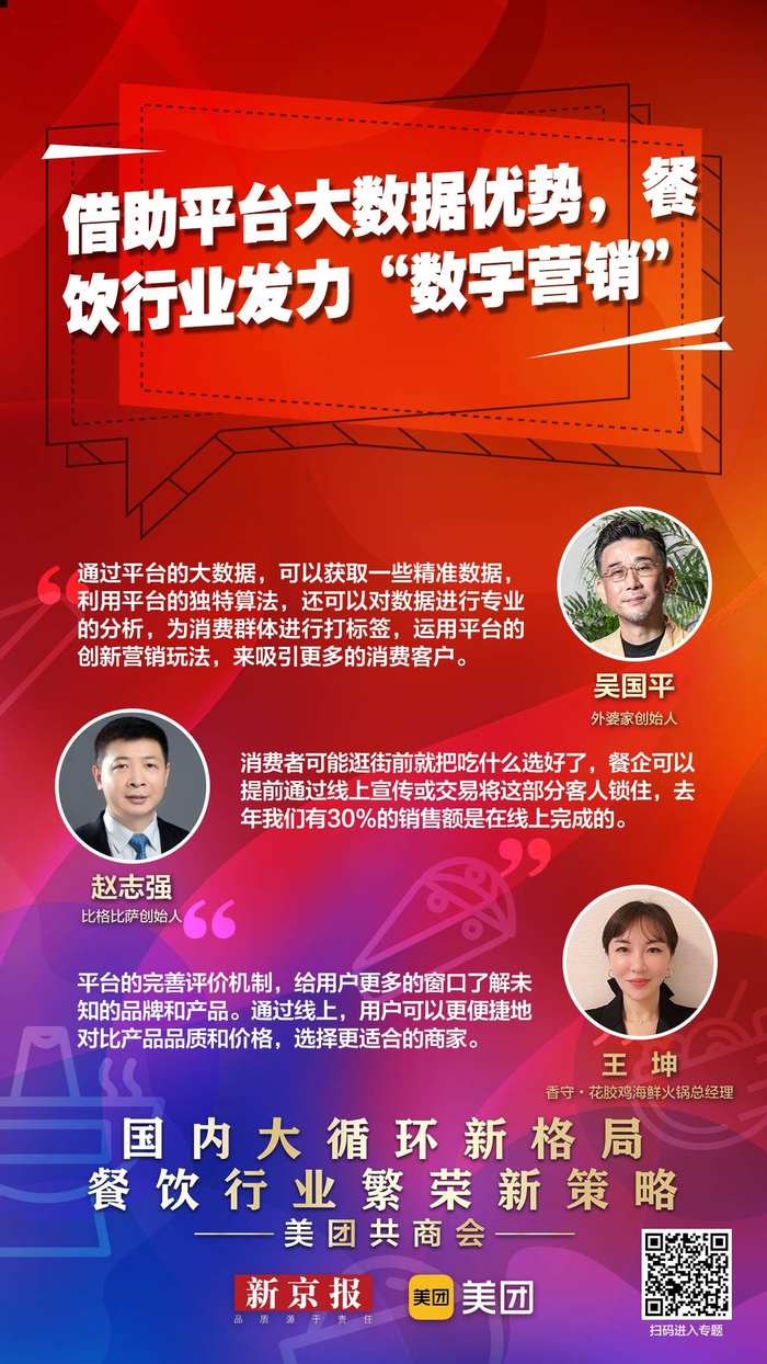 新京报讯(记者 王春蕊)随着信息技术的不断发展,人们的餐饮消费场景也在不断变化,餐饮营销也逐渐成为餐饮行业发展的重头戏。近日,美团联合新京报共同发起“国内大循环新格局,餐饮行业繁荣新策略”共商会,邀请多方专家与餐饮代表,共同探讨餐饮行业的“数字营销”。