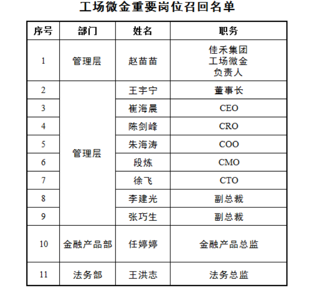 据统计,自2019年7月18日至2020年4月1日,工场微金官方公号共发了23条平台工作动态及平台官宣,记者注意到,几乎每条都含关于重要岗位召回高管的内容。其中,佳禾集团/工场微金的负责人赵苗苗,工场微金的董事长王宇宁及CEO崔海晨、CRO陈剑峰等人均出现在“召回名单”中(如图4所示)。