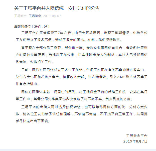 2019年8月7日,官方公号发布《关于工场平台并入网信统一安排兑付的公告》(如图2所示)。工场微金表示,鉴于“部分资产端、借款企业跟网信有重合,催收和处置资产时间较长等原因,为提高工作效率,切实保障出借人的利益,实控人已委托网信代为统一安排相关工作。”同时,工场微金强调,“网信方面承诺本着一视同仁的原则,将工场微金平台的后续工作统一安排在其日常工作中,其母公司先锋集团也多次表达了将不离不弃、负责到底的态度。”