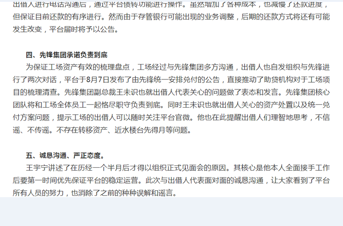 根据官方公号对当时会议的记录,先锋集团再次承诺对工场微金负责到底(如图3所示)。“为保证工场资产有效的梳理盘点,工场经过与先锋集团多方沟通,出借人也自发组织与先锋进行了两次对话,平台于8月7日发布了由先锋统一安排兑付的公告,直接推动了助贷机构对于工场项目的梳理清查。”