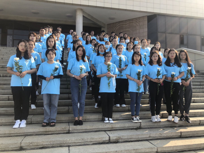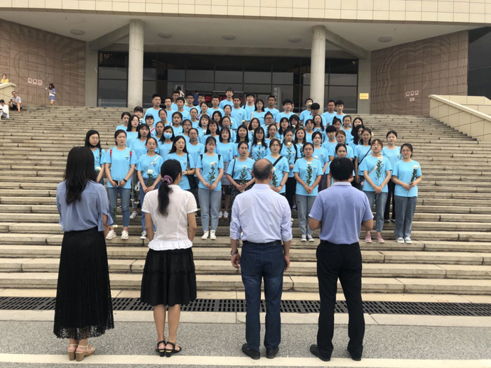 9月10日上午8:30,基础医学院2020级硕士一班全体同学身着文化衫,佩戴校徽,手持菊花,在图书馆前集合。