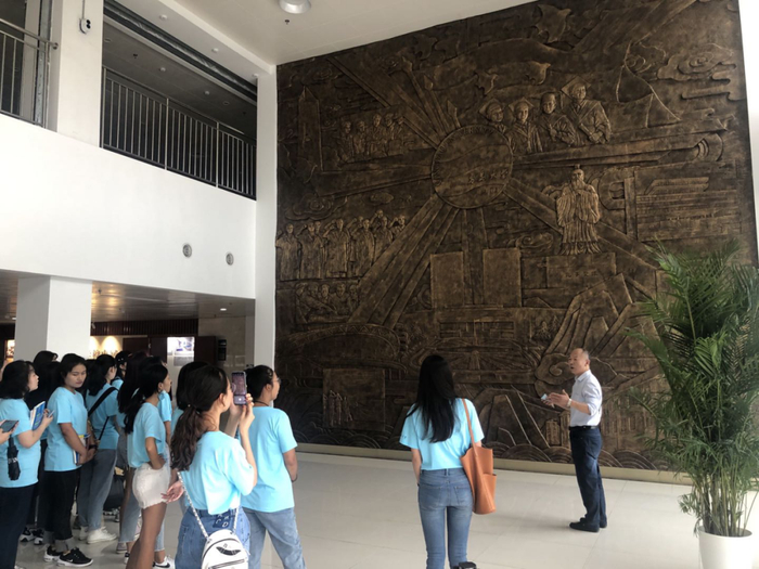 为保证学习效果,现场参观学习分两组交叉进行,每组35人。一组首先参观了青岛大学校史馆,学生志愿者向研究生们介绍青岛大学的发展历程及学校在教学、育人、科研、社会服务、基本建设、国际交流等方面取得的成绩。二组来到沈福彭石碑前,辅导员谭雪梅向同学们简单介绍了沈福彭教授的事迹及石碑上的文字。沈福彭“鞠躬尽瘁,死而不已”的精神感动和激励着无数青医人奋发向上、无私奉献,同学们也深受感染,全体同学向沈福彭鞠躬并敬献鲜花。