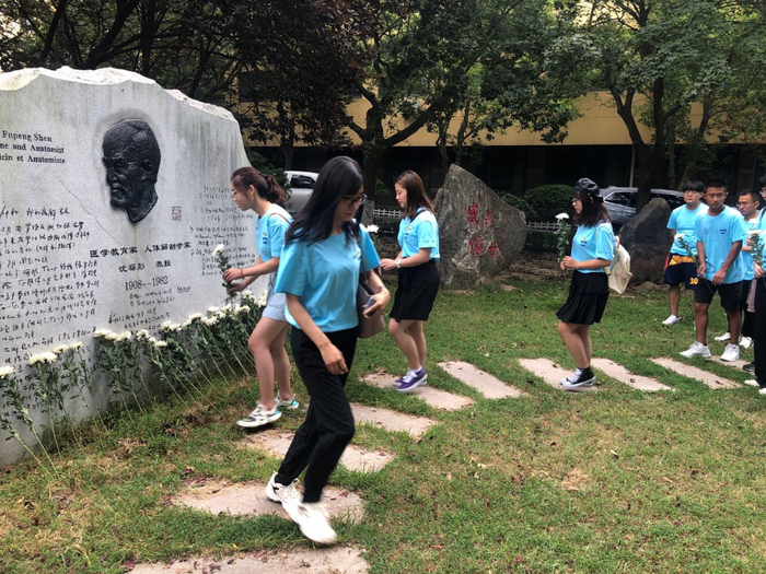 在医学发展使馆,学生志愿者为研究生们介绍了学院的110年的发展历史和名师校友的故事。沈福彭、潘作新、徐佐夏、穆瑞武、马贤成、田浩泉、金泽忠、冯雁忱等一大批青医先辈们严谨治学、甘为人梯的精神,让同学们深受感动。站在沈福彭遗骸前,再次聆听教授的生平和事迹,大家为教授“鞠躬尽瘁,死而不已”的精神所震撼。中国科学院院士、心脏病学专家、84届校友葛俊波、获“医学翻译特别奖”的56届校友王贤才、被称为“南寿北程”的断肢再造方面专家寿奎水、程国良等知名校友的故事,让同学们深受鼓舞。