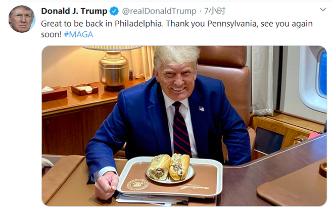 “很高兴回到费城。谢谢宾夕法尼亚州,再见!”特朗普发推写道,后面还带有一个“让美国再次伟大”英文首字母缩写标签。推文配图中,他身穿蓝色西装,面前的餐盘上放着两个热狗,面对镜头的他露齿微笑。↓