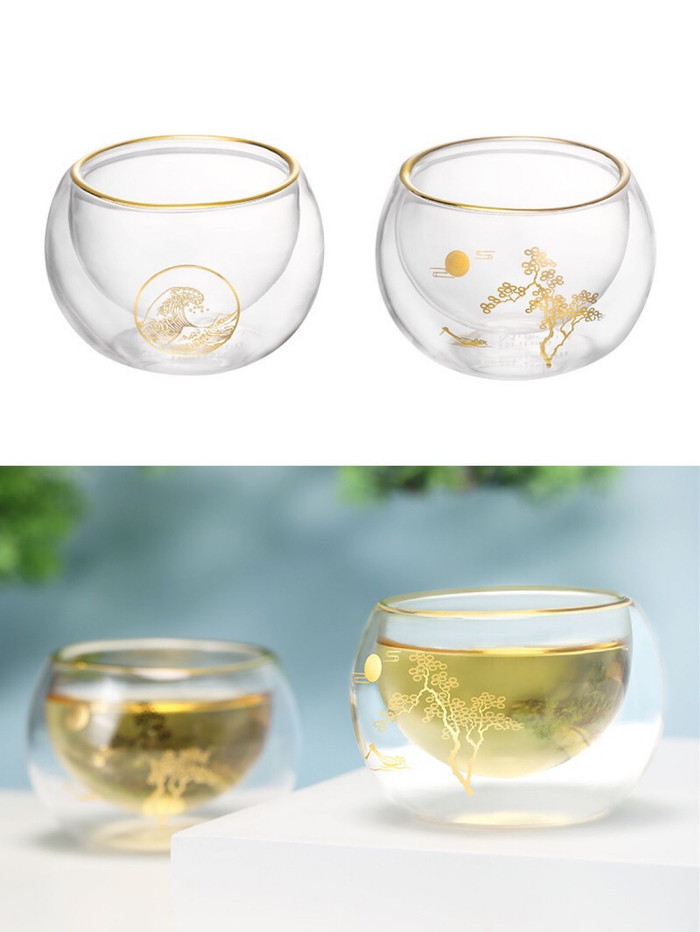 在这套玻璃杯中,一只是葛饰北斋最富盛名的“富岳三十六景”之神奈川冲浪里,另一只则是《诗歌写真镜》系列中赏月的阿倍仲麻吕。中秋节定型于唐代初年,阿倍仲麻吕是日本遣唐使,因“慕中国之风”归国又返,最后在长安辞世。月圆之夜,思乡之情,尽在一杯中。