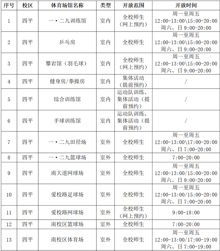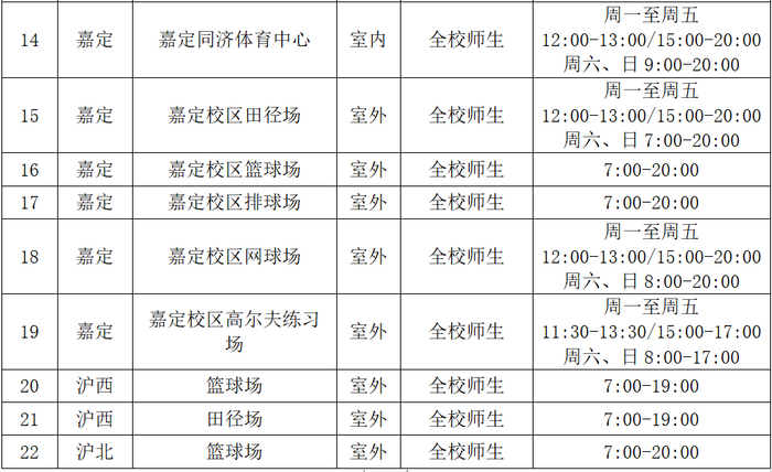 同济大学体育场馆开放信息(2020.9)