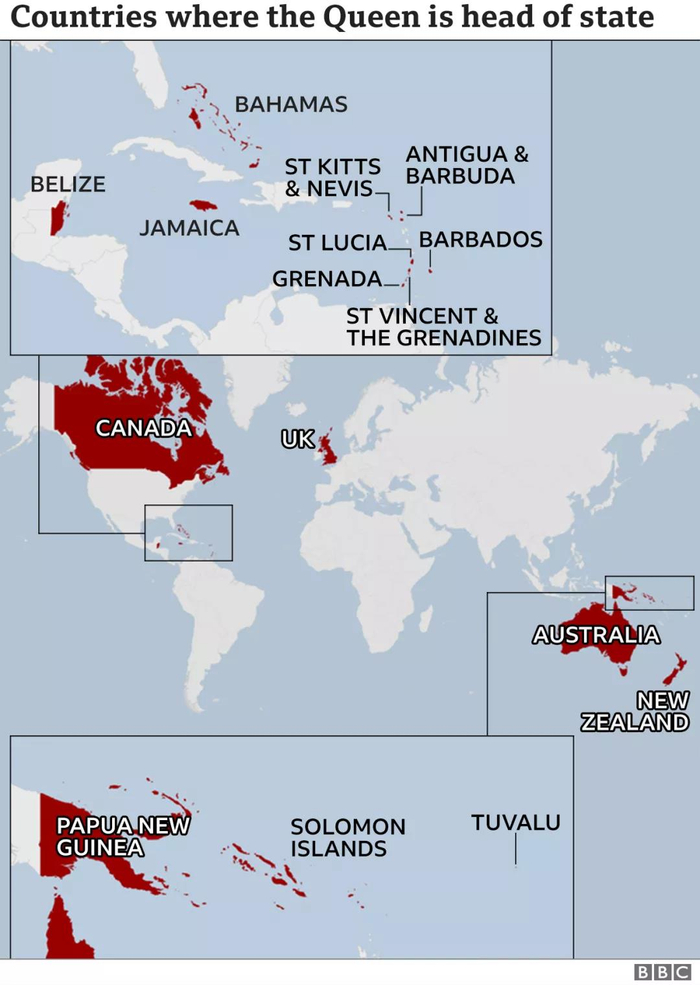 事实上,除英国、巴巴多斯外,英国女王伊丽莎白二世还是其他14个国家的国家元首。具体包括澳大利亚、加拿大、新西兰、安提瓜和巴布达、巴哈马、伯利兹、格林纳达、牙买加、巴布亚新几内亚、圣基茨和尼维斯、圣卢西亚、圣文森特和格林纳丁斯、所罗门群岛、图瓦卢。