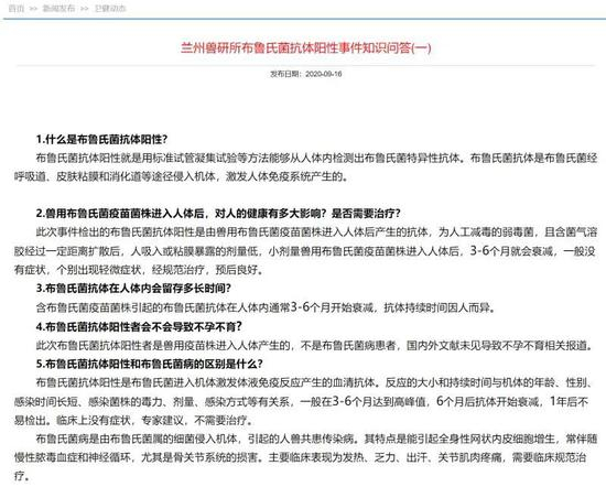 9月16日,兰州市卫健委专门在官方网站上针对受影响群众的疑问做出回答,强调布鲁氏菌抗体阳性和布鲁氏菌病是有区别的,前者是细菌进入机体激发体液免疫反应产生的血清抗体,一般在3-6个月达到高峰值,6个月后抗体不易检出,临床上没有症状,不需要治疗。