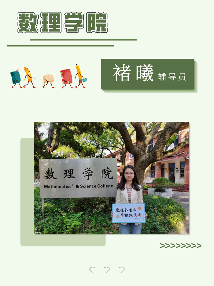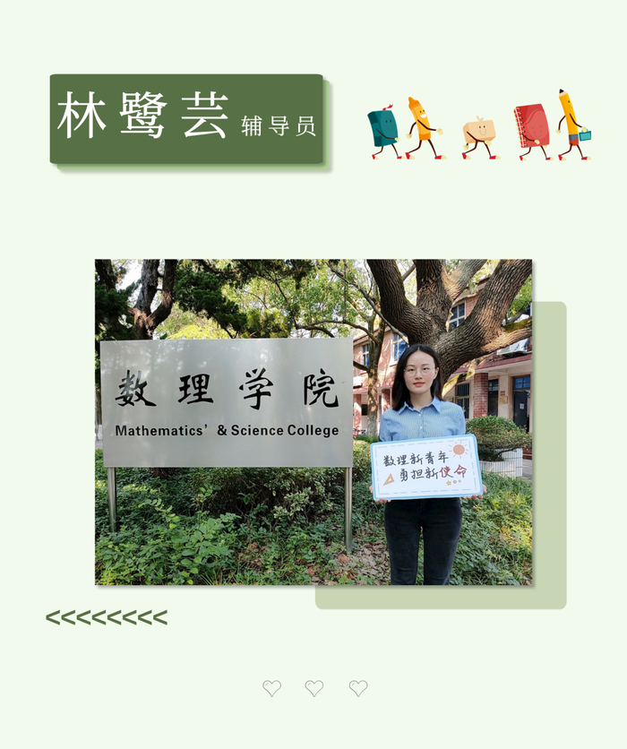 王乃芯,现任体育学院2020级本科新生辅导员,毕业于华东师范大学数学科学学院应用数学专业。本科曾获国家奖学金、上海市优秀毕业生等荣誉。就读研究生期间曾获中国研究生数学建模竞赛全国一等奖。