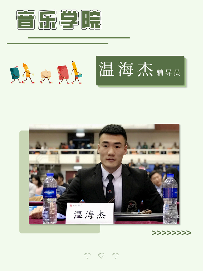 温海杰,现任音乐学院辅导员,毕业于北京体育大学体育教学专业。曾荣获北京市优秀毕业生、北京体育大学优秀毕业生、优秀学生干部、三好学生。