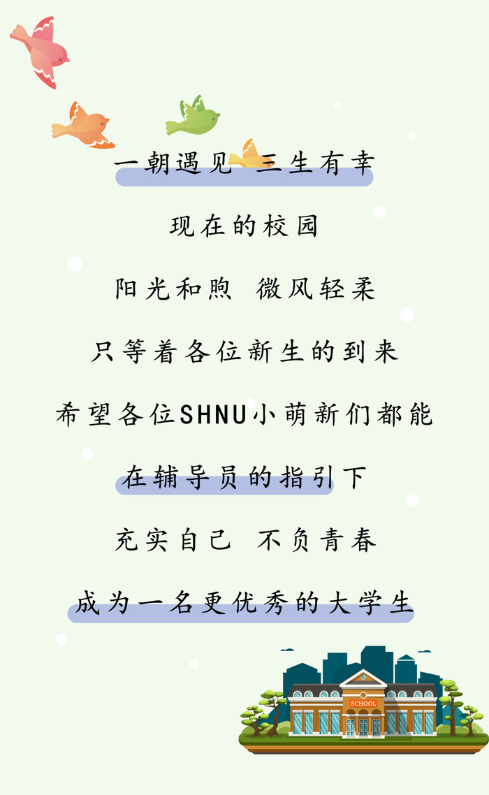 亲爱的2020级同学们,欢迎加入上海师范大学,成为SHNUer的一员。在这里,你们将度过人生中极为关键的四年,学习知识,训练技能,发展友谊,探索自我,选择职业。不要担心过去,不要担心未来,不要担心长大,不要担心还没有发生的一切,我会一直陪你们成长。现在,一切都是新的开始。把握当下,从心出发吧!
