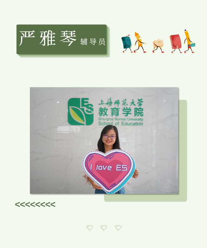 严雅琴,毕业于华东师范大学学前教育专业。全球职业规划师(GCDF)。曾获上海市优秀毕业生、上海师范大学军训优秀指导员等荣誉称号。所指导学生项目获市级“互联网+”大赛铜奖,曾赴南京师范大学挂职锻炼。
