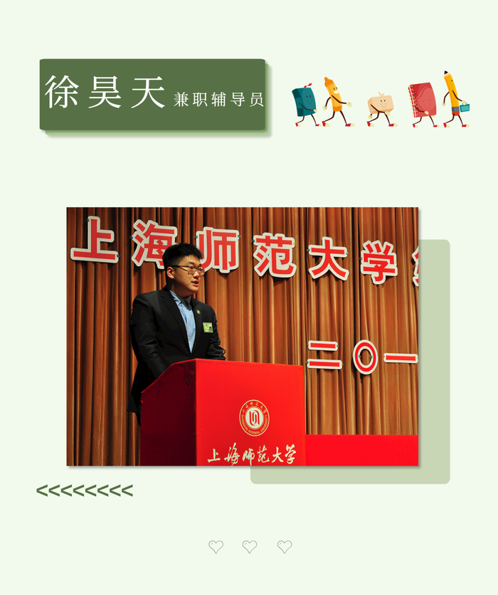徐昊天,香港教育大学公共政策及管理硕士。本科毕业于上海师范大学人文学院古典文献学专业,曾担任校学生会副主席,曾荣获第十五届“挑战杯”全国大学生课外学术科技作品竞赛特别贡献奖、上海市奉贤区优秀共青团员。