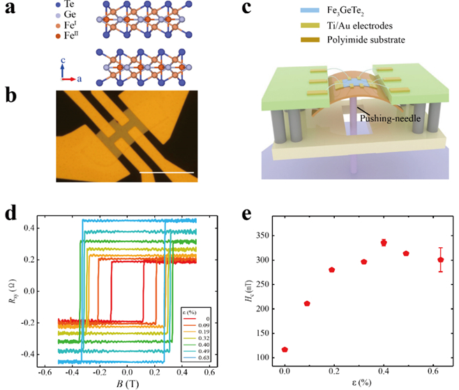 图1. (a)Fe3GeTe2晶格结构图;(b)柔性衬底器件的光学照片;(c)原位应变装置示意图;(d)1.5K时不同应变对应的磁滞回线;(e)不同应变下矫顽场的变化曲线。